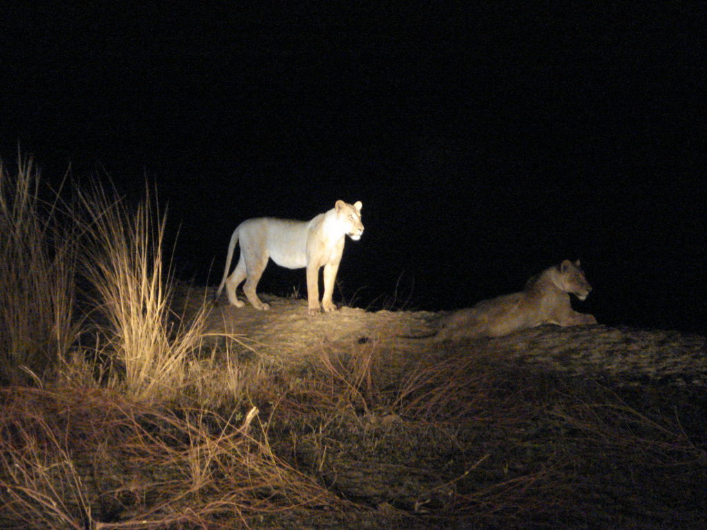 luipaarden. Die laatste hebben we nog niet gezien. Na de ochtend drive/wandeltocht weer terug naar de lodge voor een lekkere lunch. Daarna even relaxen in de zon bij het leuke zwembadje op een verhoging aan de oever van de rivier, vlak naast onze huisjes. Het is hier duidelijk warmer dan in de andere gebieden tot nu toe.zo'n 30 graden. Maar niet benauwd, dus heerlijk. Om 15.00 uur verzamelen we ons weer voor een namiddag/avond game drive vanaf 15.30. Eerste deel game drive, daarna een sundowner en vervolgens een zgn nightdrive in het donker met zoeklichten. Dat hadden we nog niet gedaan en daarmee is een redelijke kans op leeuwen en luipaarden. Tijdens de gewone drive de gebruikelijke dieren, olifanten, kroko's, impala's, nog meer impala's, olifanten en giraffen. De nachtdrive met zoeklichten (een zgn spotter met zoeklicht gaat mee in de jeep) was spannend. Je kan